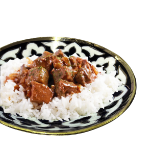 Печень говяжья, рис, сметана, лук, томаты черри, специи
