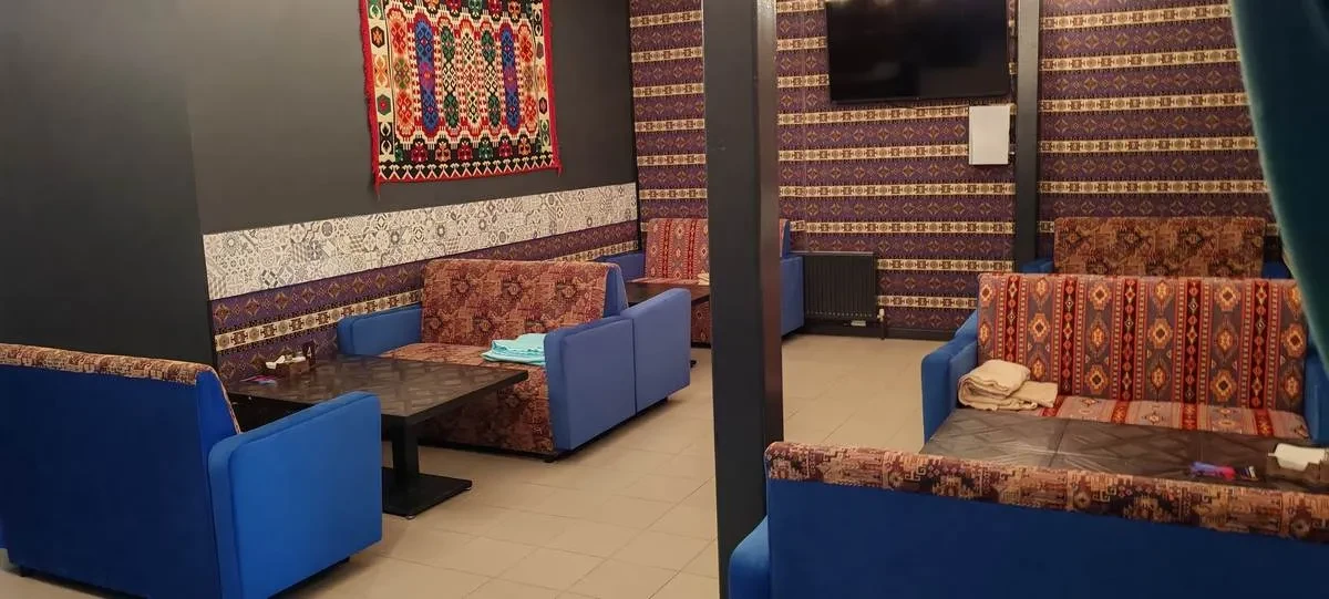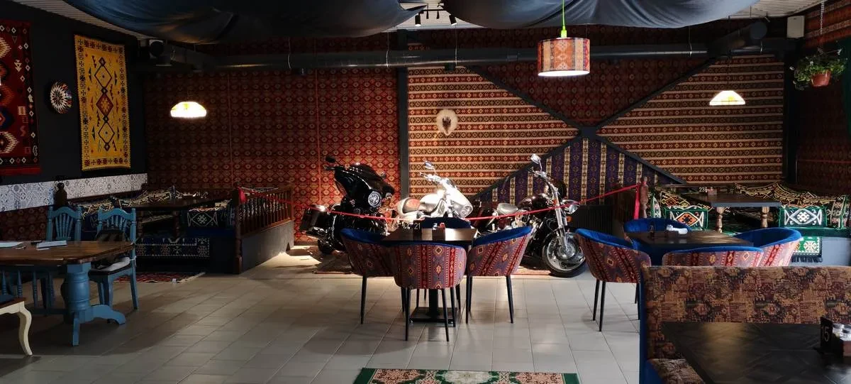 В интерьере акценты расставлены за счет мягкого и тёплого освещения тёмных нейтральных тонов. Помещение наполнено мягкими поверхностями, тканью и самобытным декором. Инсталляция у бара с мотоциклом в стиле ..... Главный напиток бара – чай.