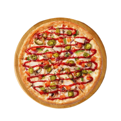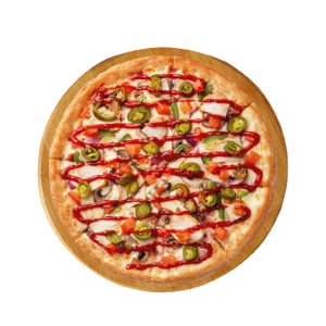 Тесто, сыр Моцарелла, соус "Чипотле", курица копченная, сосиски говяжьи, перец острый, черри, лук красный маринованный