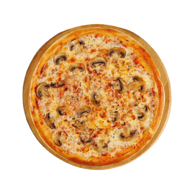 Тесто, соус "Пармеджано", сыр "Моцарелла", филе куриной грудки, шампиньоны, соус