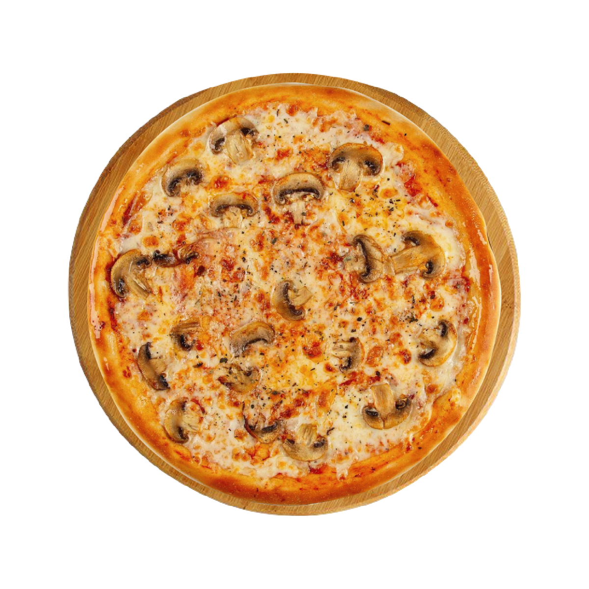 Тесто, соус "Пармеджано", сыр "Моцарелла", филе куриной грудки, шампиньоны, соус